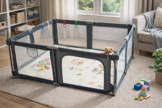Corral para bebe de seguridad plegable + Alfombra antigolpe Gris