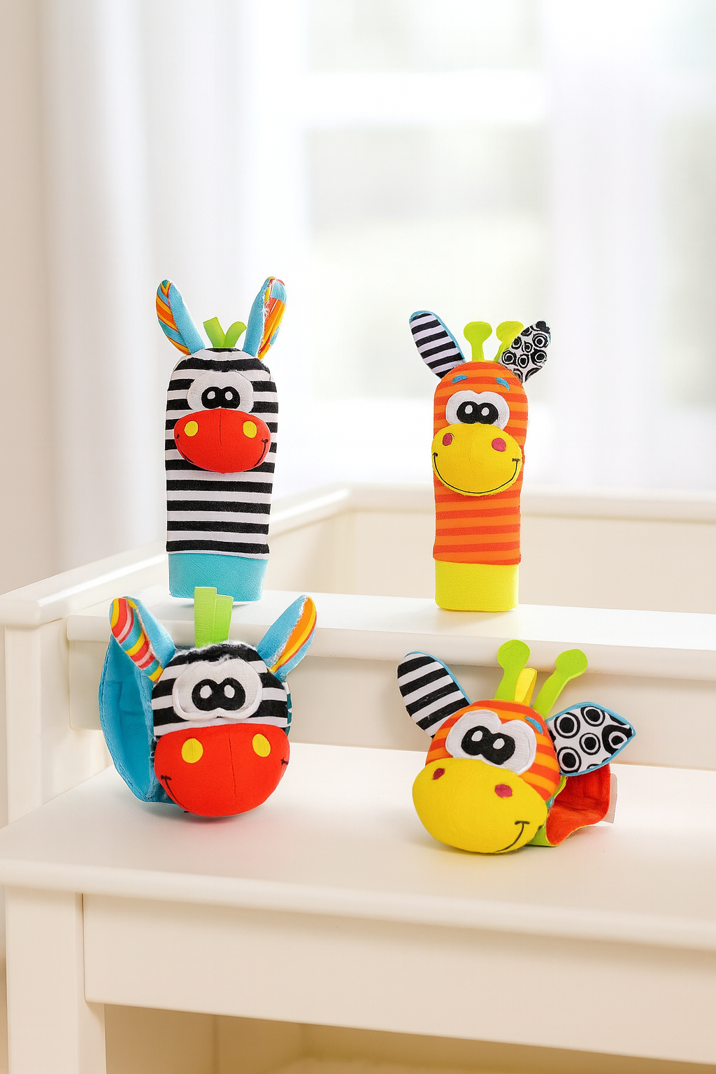 🧦 Par de calcetines y muñequeras con sonajero: ideales para estimular el movimiento, la coordinación y la curiosidad del bebé.